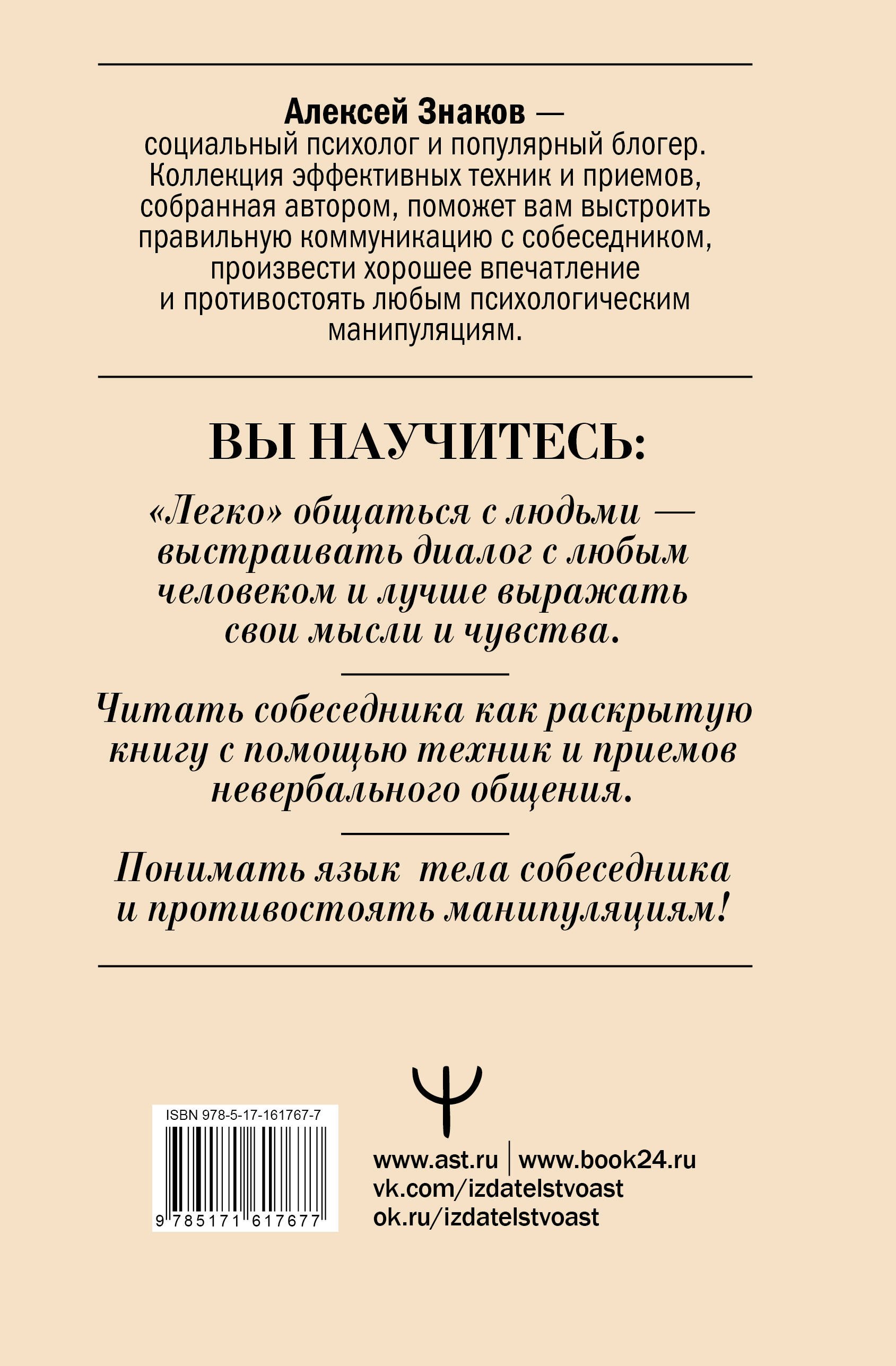 Понимание языка тела — одна из важнейших составляющих успешного общения! Алексей Знаков — социальный психолог и блогер — в своей книге «Язык тела в действии. Эффективные приемы и техники для понимания людей по мимике и жестам» раскрывает секреты межличностного общения, которые помогут вам выстроить правильную коммуникацию, создать правильное впечатление о себе, научат читать язык тела собеседника. Вы сможете: · выстроить правильный диалог с любым собеседником; · произвести хорошее впечатление при знакомстве; · разговорить любого, даже самого молчаливого собеседника; · лучше понимать окружающих и выражать то, что вы хотите сказать; · избежать недопонимания и манипуляций со стороны собеседника. Книга в твердой обложке.