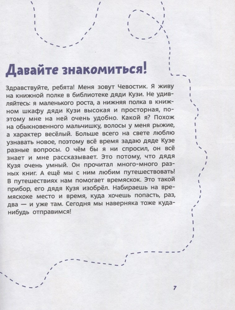 Чевостика и дядю Кузю ждут новые невероятные приключения. На этот раз они отправятся в космос. Герои изучат историю космонавтики, побывают на Международной космической станции и увидят приземление космонавтов. А читатели будут наблюдать за первым полетом человека в космос и узнают, можно ли выпить чашечку чая в невесомости.