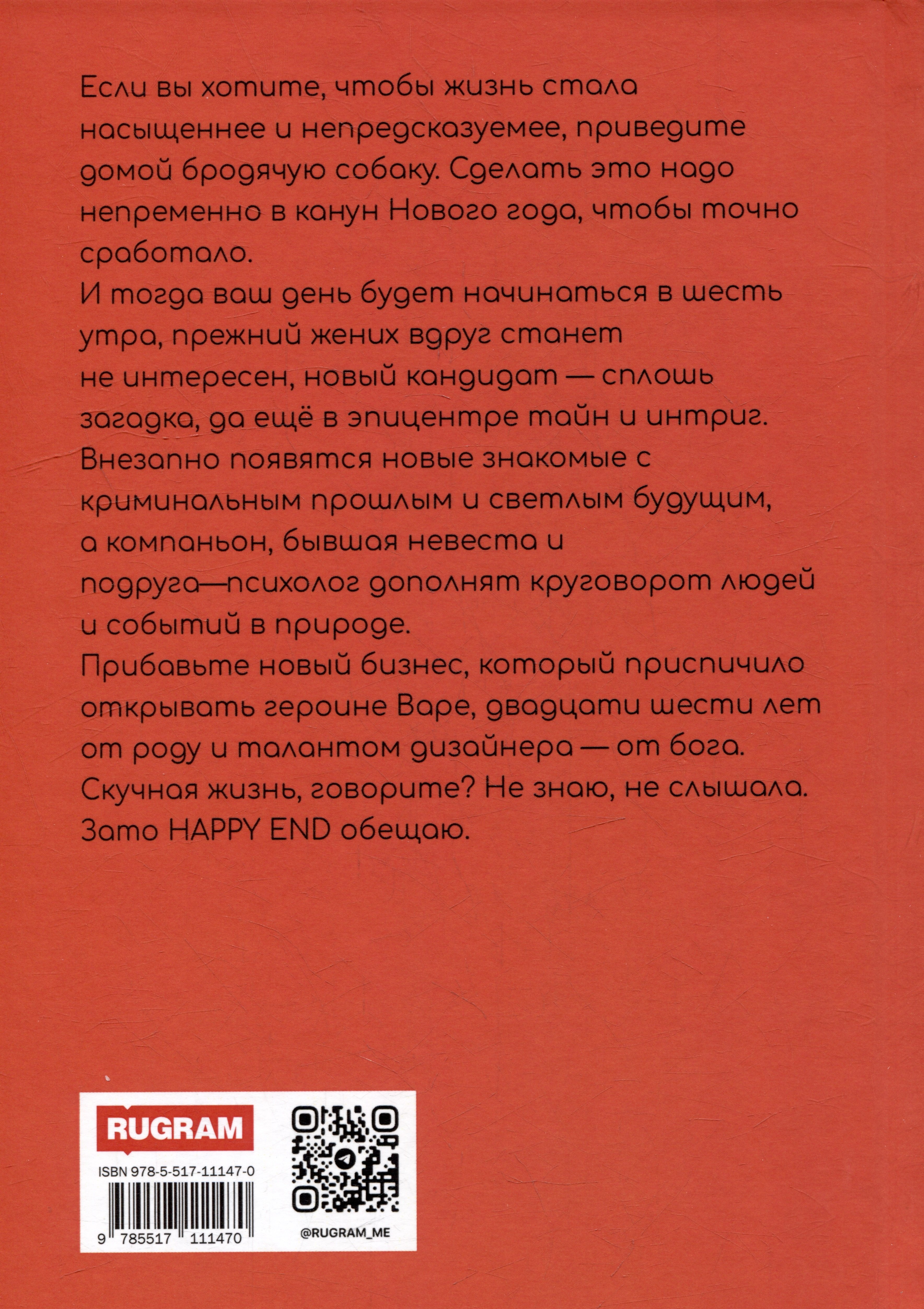 Если вы хотите, чтобы жизнь стала насыщеннее и непредсказуемее, приведите домой бродячую собаку. Сделать это надо непременно в канун Нового года, чтобы точно сработало. И тогда ваш день будет начинаться в шесть утра, прежний жених вдруг станет не интересен, новый кандидат — сплошь загадка, да ещё в эпицентре тайн и интриг. Внезапно появятся новые знакомые с криминальным прошлым и светлым будущим, а компаньон, бывшая невеста и подруга — психолог дополнят круговорот людей и событий в природе. Прибавьте новый бизнес, который приспичило открывать героине Варе, двадцати шести лет — от роду и талантом дизайнера — от бога. Скучная жизнь, говорите? Не знаю, не слышала. Зато HAPPY END обещаю.