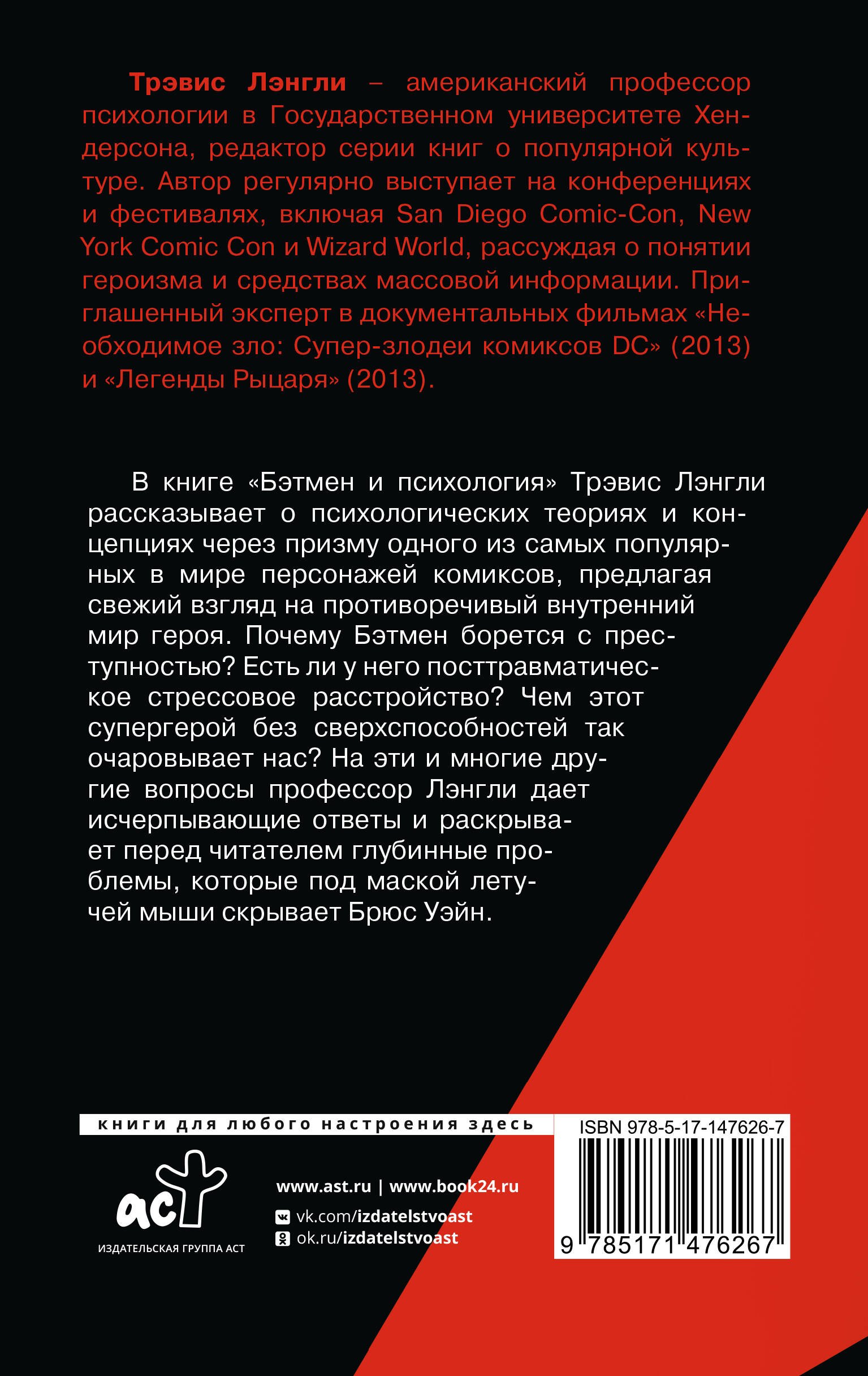 Трэвис Лэнгли – американский профессор психологии, редактор серии книг о популярной культуре. Автор регулярно выступает на конференциях и фестивалях, включая San Diego Comic-Con, New York Comic Con и Wizard World. Приглашенный эксперт в документальных фильмах DC Comics.О книге "Бэтмен и психология: что скрывает Темный рыцарь":Трэвис Лэнгли рассказывает о психологических теориях и концепциях через призму одного из самых популярных в мире персонажей комиксов, предлагая свежий взгляд на противоречивый внутренний мир героя. Почему Бэтмен борется с преступностью? Есть ли у него посттравматическое стрессовое расстройство? Чем этот герой без сверхспособностей так очаровывает нас? На эти и другие вопросы профессор Лэнгли дает исчерпывающие ответы и раскрывает перед читателем глубинные проблемы, которые под маской летучей мыши скрывает Брюс Уэйн.Издание содержит иллюстрации.Из книги "Бэтмен и психология: что скрывает Темный рыцарь" вы узнаете:• Историю создания персонажа;• Историю комиксов и кино;• Основные психологические понятия и диагнозы;Для кого эта книга:• Для любителей комиксов, кино и сериалов;• Для интересующихся психологией.