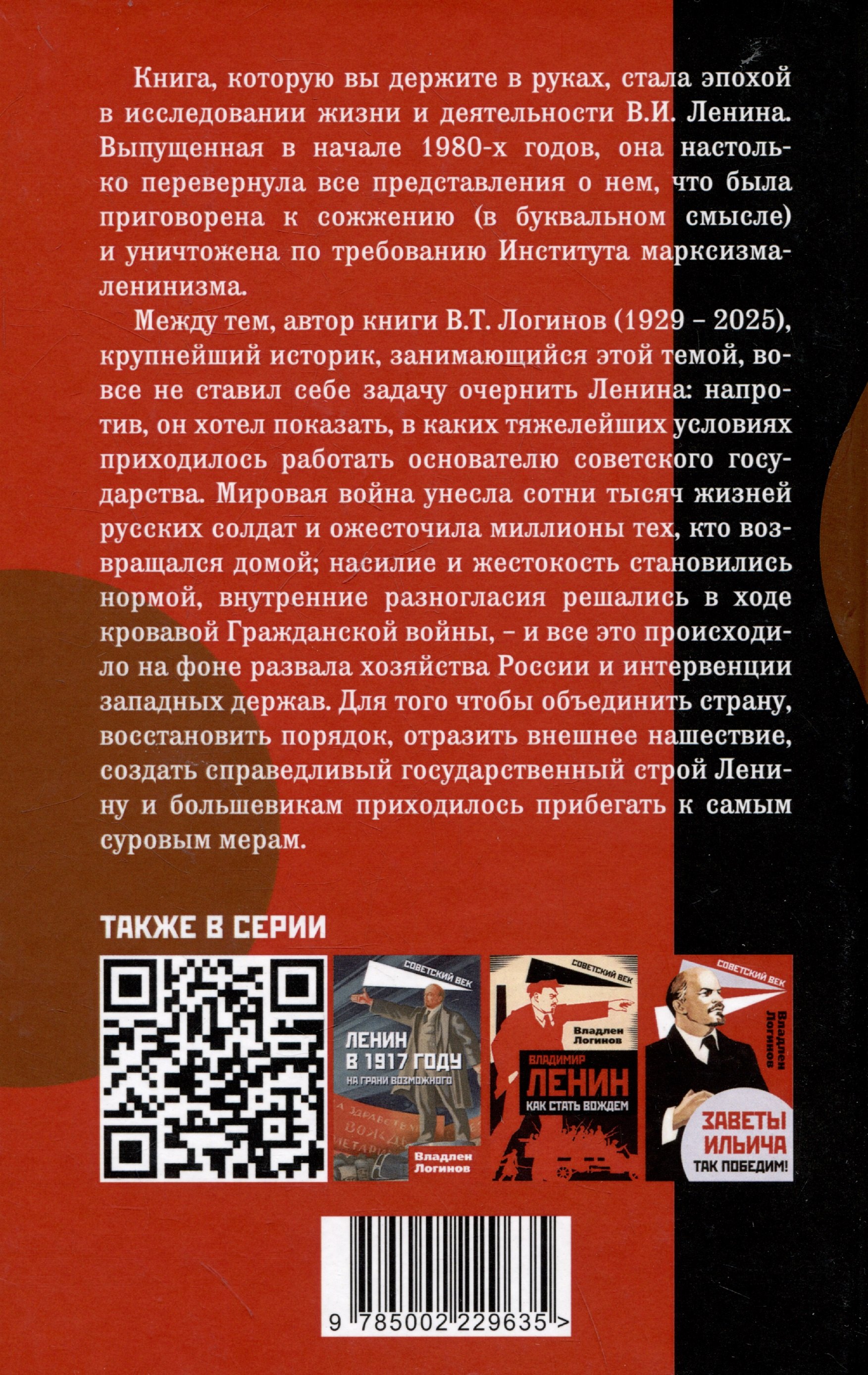Книга, которую вы держите в руках, стала эпохой в исследовании жизни и деятельности В.И. Ленина. Выпущенная в начале 1980-х годов, она настолько перевернула все представления о нем, что была приговорена к сожжению (в буквальном смысле) и уничтожена по требованию Института марксизма-ленинизма. Между тем, автор книги В.Т. Логинов (1929 – 2025), крупнейший историк, занимающийся этой темой, вовсе не ставил себе задачу очернить Ленина: напротив, он хотел показать, в каких тяжелейших условиях приходилось работать основателю советского государства. Мировая война унесла сотни тысяч жизней русских солдат и ожесточила миллионы тех, кто возвращался домой; насилие и жестокость становились нормой, внутренние разногласия решались в ходе кровавой Гражданской войны, – и все это происходило на фоне развала хозяйства России и интервенции западных держав. Для того чтобы объединить страну, восстановить порядок, отразить внешнее нашествие, создать справедливый государственный строй Ленину и большевикам приходилось прибегать к самым суровым мерам
