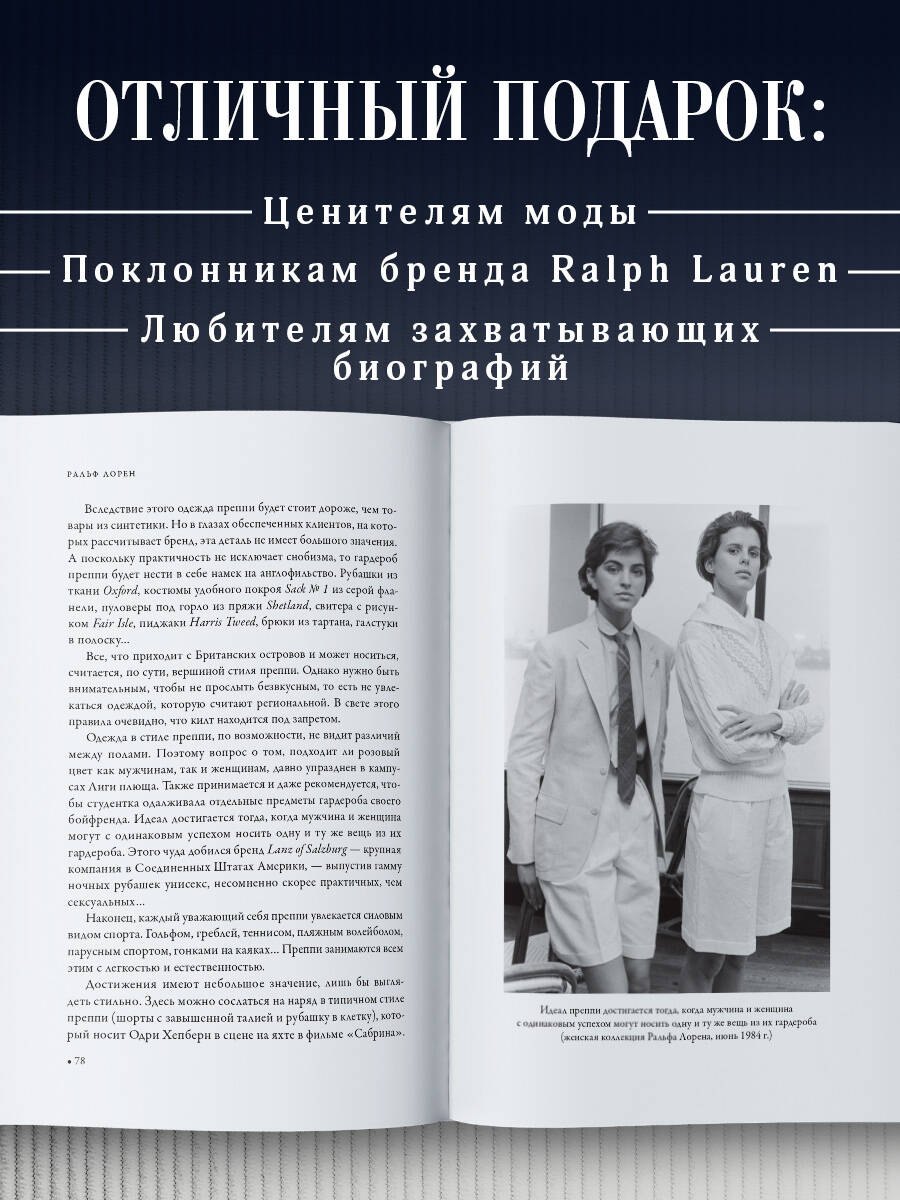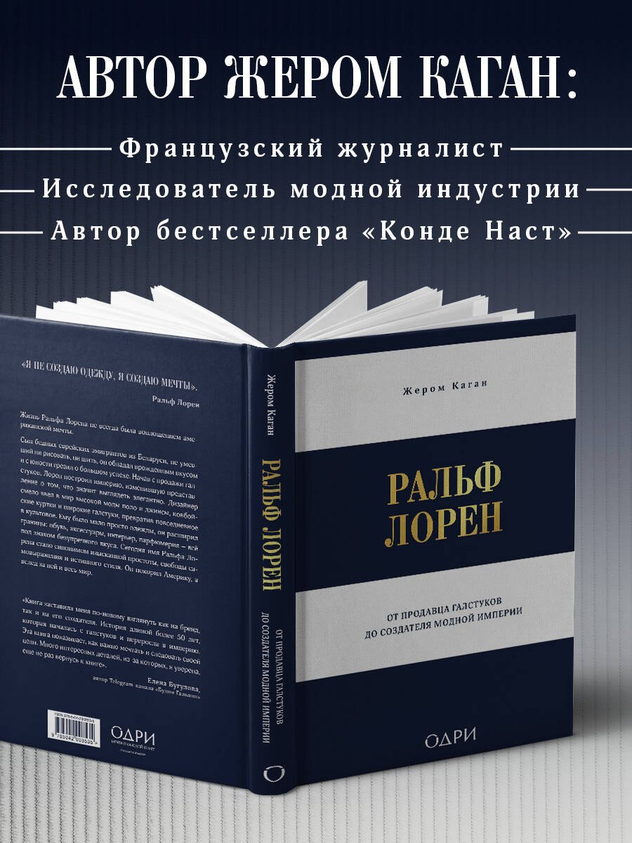 Автор книги, французский журналист Жером Каган, прослеживает более полувека пути Лорена: от скромного продавца галстуков до создателя модной империи. Издание сопровождают редкие фотографии самого дизайнера, его семьи и легендарных коллекций, ставших частью американской мечты.
