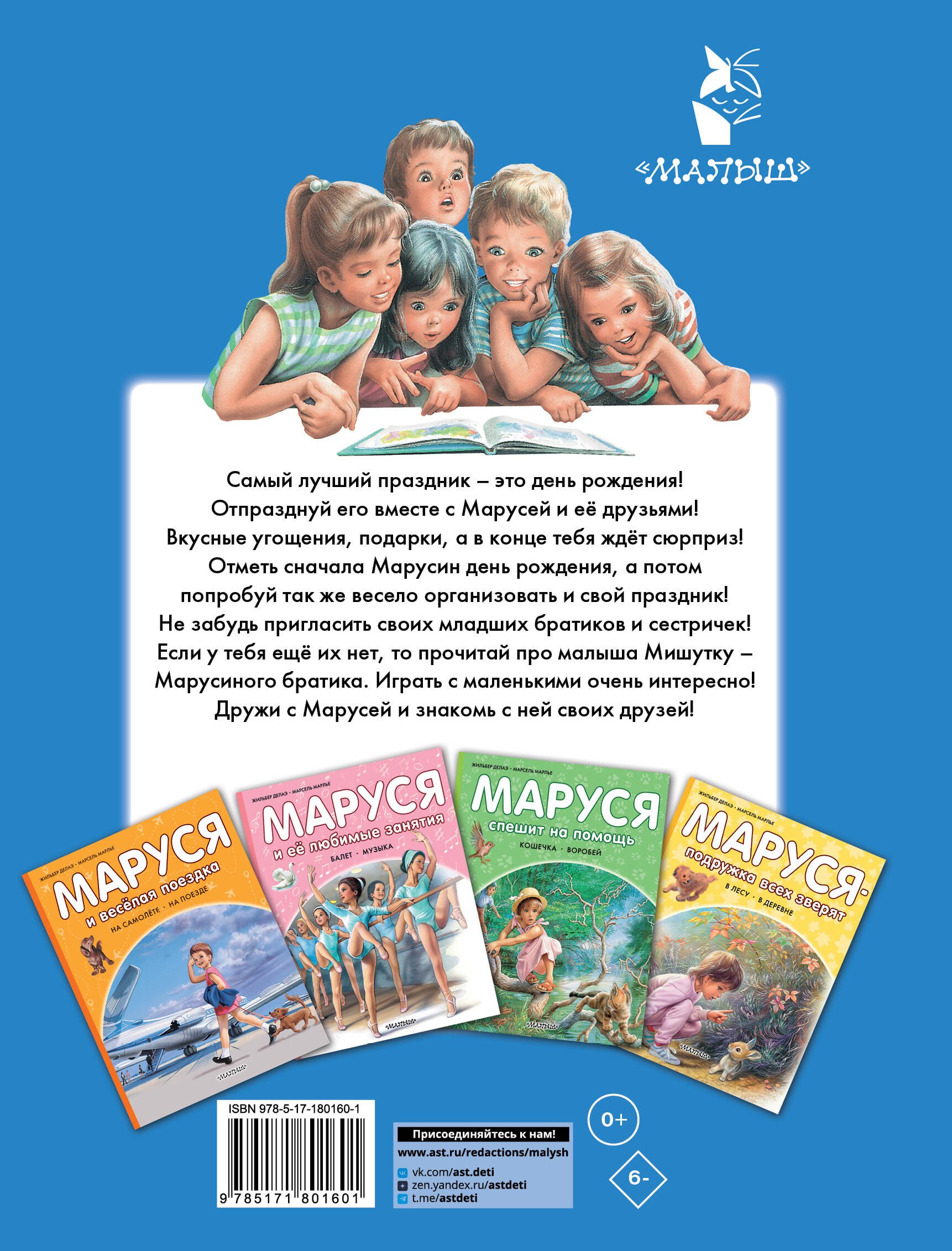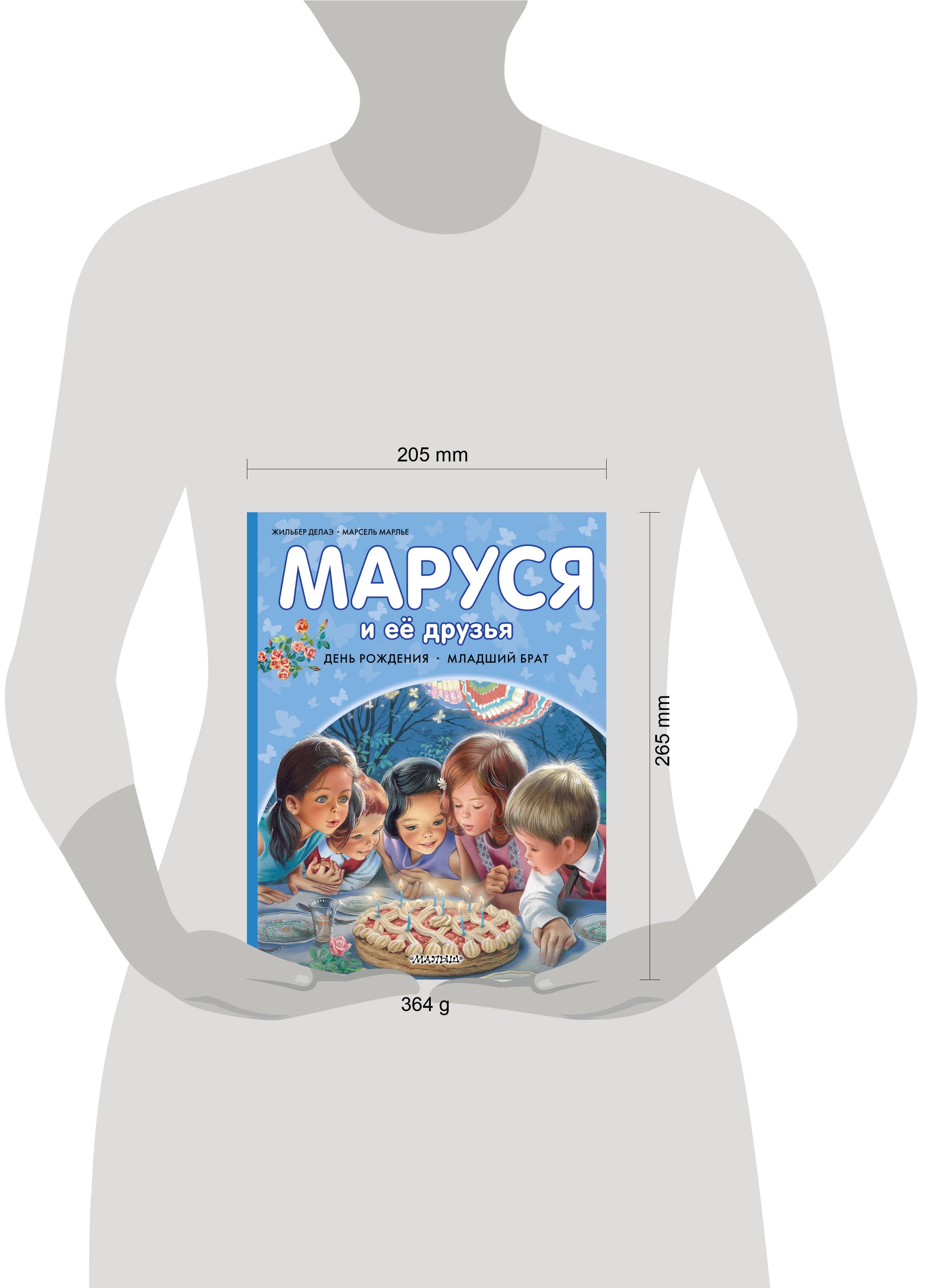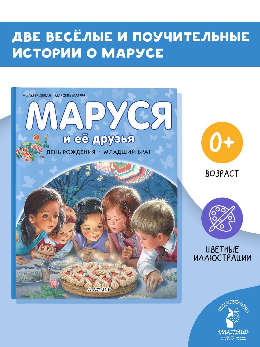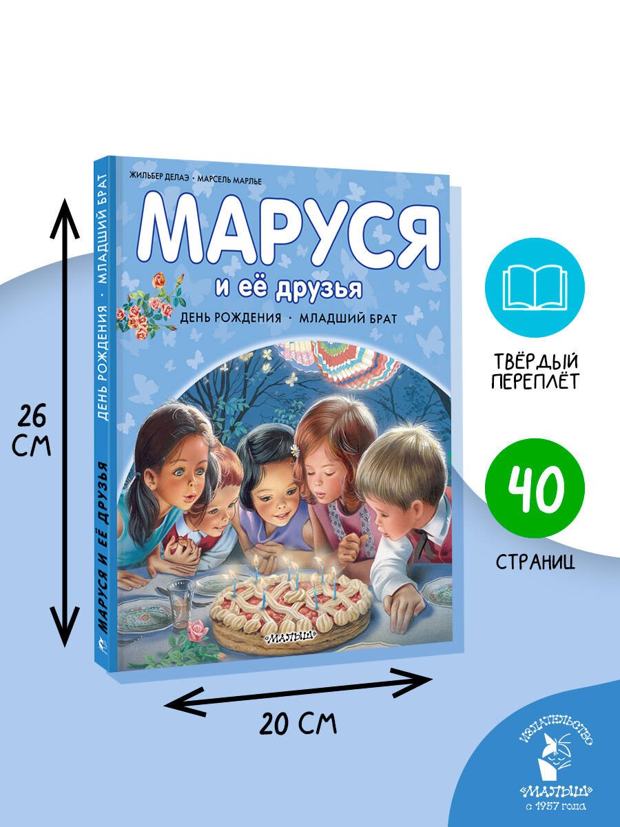 В книгу "Маруся и её друзья" вошли две истории об этой общительной девочке. В первой истории Маруся вместе с друзьями и семьёй устраивает весёлой праздник в честь своего дня рождения. Вкусные угощения, подарки, фейерверки — всё, что так любят дети! А во второй истории Маруся остаётся дома за старшую и ухаживает за младшим братиком. Эта книжка прекрасно подготовит старшего ребёнка к появлению нового члена семьи!